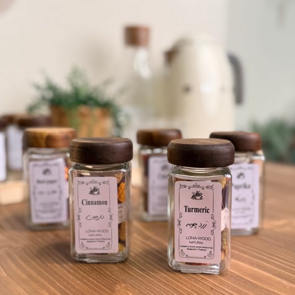 ادویه‌پاش شیشه‌ای با درب چوبی – ترکیب زیبایی، کیفیت و طبیعت در آشپزخانه شما