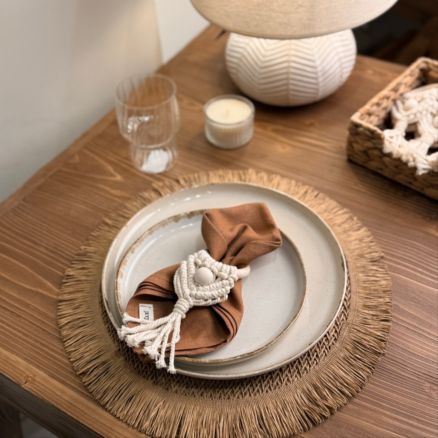 با حلقههای دستمال سفره مکرومهای، میز پذیرایی خود را به صحنهای از هنر و زیبایی تبدیل کنید. این حلقهها بافت دستی دارند و از نخهای کتان طبیعی با گرههای سنتی مکرومه ساخته شدهاند. وجود حلقه چوبی و مهره مرکزی، جلوهای گرم و طبیعی به دکور میز میبخشد.