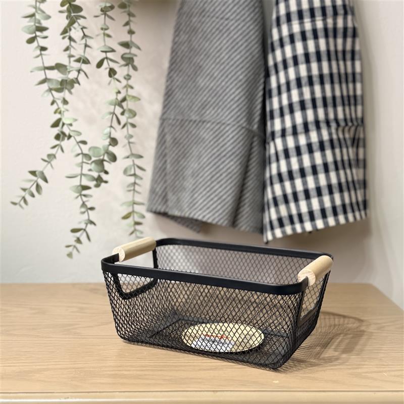 به دنبال یک سبد نظمدهنده فلزی زیبا و مقاوم هستید؟ این سبد توری فلزی مشکی با طراحی مینیمال و دستههای چوبی، بهترین راهکار برای نظم بخشیدن به فضای شماست.