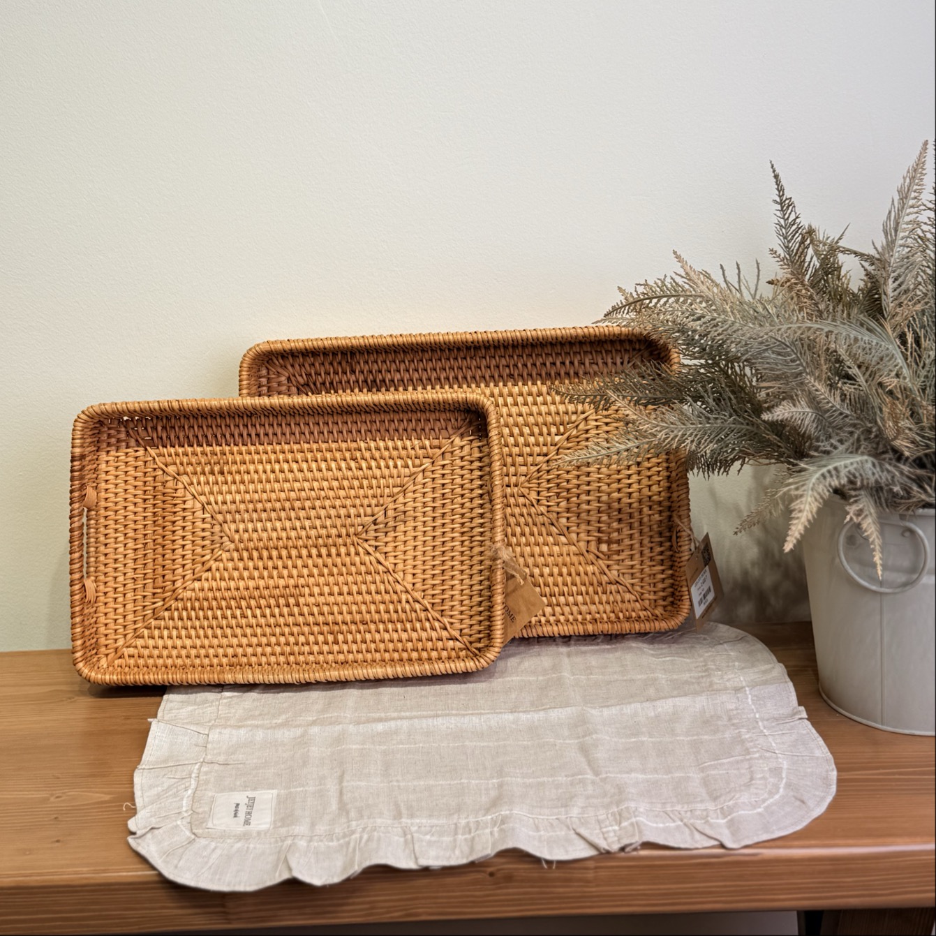 • سبک دکوراسیون: بافت طبیعی و رنگ گرم آن، این سینی را به گزینهای عالی برای تکمیل دکوراسیون به سبک بوهو (Boho)، روستیک (Rustic) یا مزرعهای (Farmhouse) تبدیل میکند.